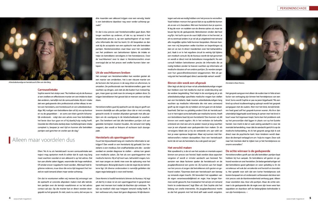 Sophie neemt het stokje over. “Nu hebben wij als de Bureaus al een snellere en effectievere manier om een intake te doen dan anderen, namelijk met de carrouselintake. Bij zo’n intake ziet een gedupeerde drie professionals achter elkaar, te weten een herstelarts, een herstelcoach en een arbeidsdeskundige. Wij nodigen een betrokkene dan uit bij ons op kantoor en na de gesprekken – en soms een klein gericht lichamelijk onderzoek – volgt dan een advies over hoe betrokkene het beste door kan gaan en of hij daarbij hulp nodig heeft. Doordat de informatie dankzij deze multidisciplinaire intake compleet is, bespaar je veel tijd en kunnen alle betrokken partijen veel gerichter en sneller aan de slag.”