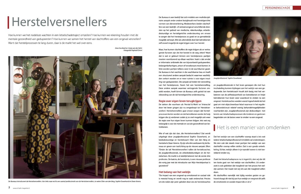 “De impact van een ongeval op emotioneel en sociaal vlak is meestal hoog en wordt nog te vaak onderschat. Precies om die reden zijn jaren geleden door ons de herstelcoaches en jeugdprofessionals in het leven geroepen die met hun inschakeling kunnen bijdragen aan het welzijn van een gedupeerde. Een herstelcoach houdt zich bezig met het verbeteren van de zelfredzaamheid van betrokkenen en helpt betrokkenen hun leven weer waardevol te vinden na een ongeval. Herstelcoaches worden vooral ingeschakeld als het gaat om niet-objectiveerbaar letsel waarvoor in het reguliere behandelcircuit relatief weinig behandelmogelijkheden voorhanden zijn. Jeugdprofessionals zijn deskundigen met kennis van letselschadeprocessen die kinderen en gezinnen begeleiden om de balans weer te vinden na een ongeval.